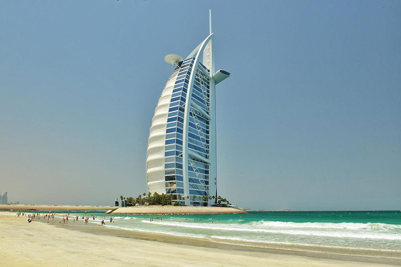 - Đoàn thăm quan và chụp ảnh bên ngoài khách sạn 7 sao Burj Al Arab hình cánh buồm bên bãi biển Jumeirah với nắng vàng và cát trắng. Với kiến trúc đặc biệt, Burj Al-Arab là “khách sạn 7 sao” đầu tiên trên thế giới và cũng là một trong những khách sạn tốt nhất thế giới hiện nay
